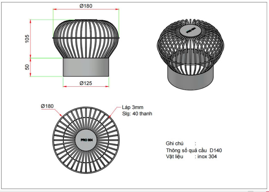 1. Thông số kỹ thuật quả cầu chắn rác inox 304 DN125 (cho ống D140):